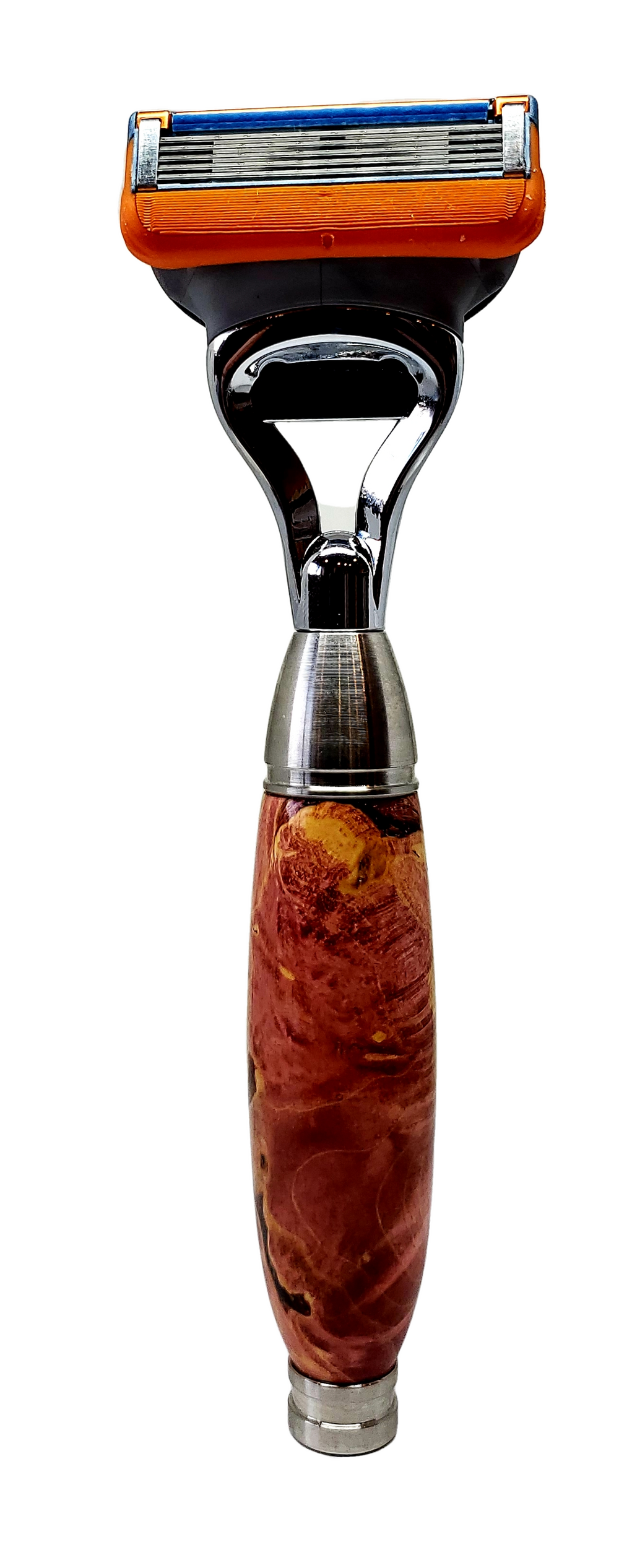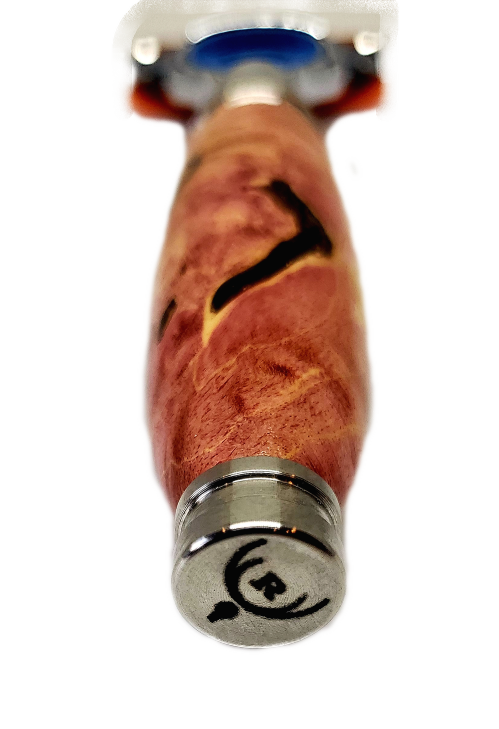 Burled box elder, crimson resin, stainless steel components