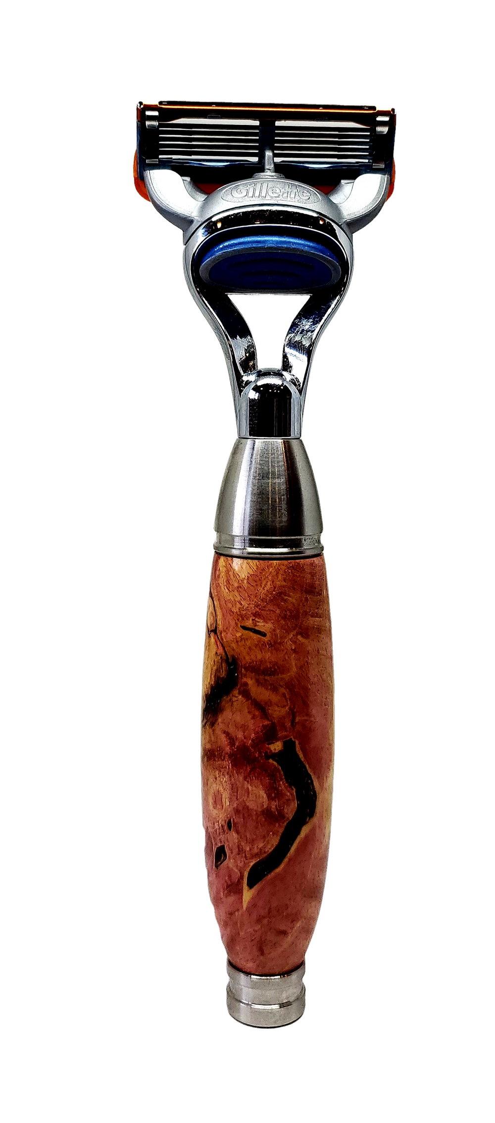 Burled box elder, crimson resin, stainless steel components